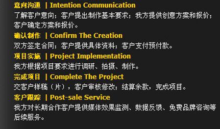 保證力——作業流程 我們一直相信,只有科學、規范的作業流程作為運作保障,優秀的創意才能得以完美的實施。在經典影視,我們一直秉承——策略精準 . 創意新銳 . 執行出色。